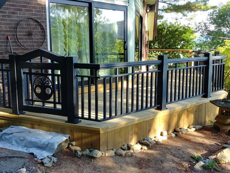 All powder coated steel, custom made railing to fit the contour of the deck, with entry gate matching the design as the driveway gate.