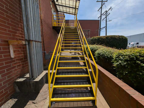 Freshly refurbished industrial staircase. Cutout and replaced all old/rotted steps with newly fabricated steps. Removed and replaced all bar grate on platform. Added two additional channels to support platform surface. Descaled all old paint and applied fresh paint to all Black and Yellow surfaces.